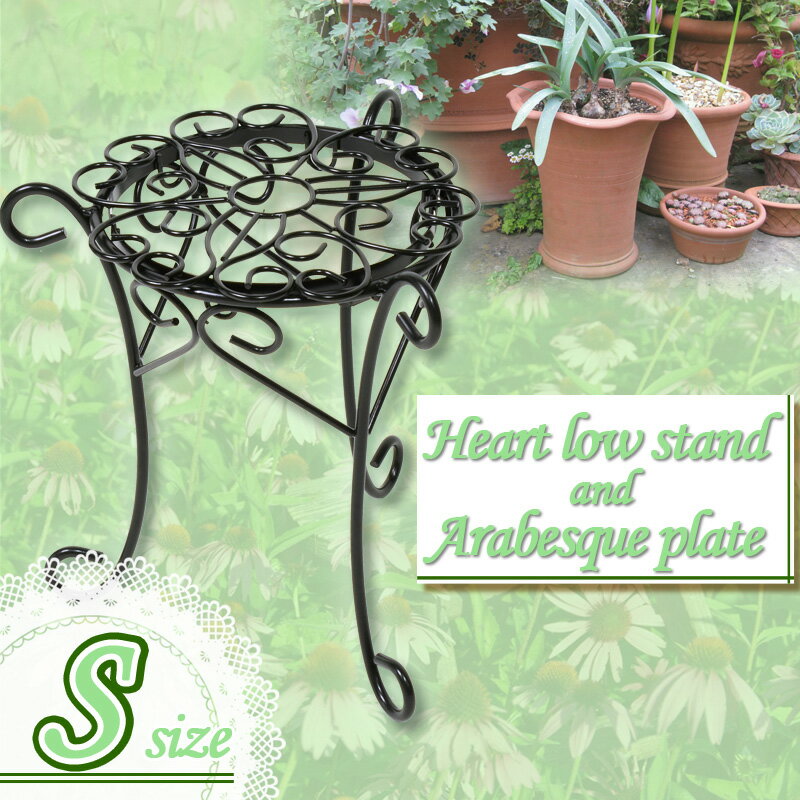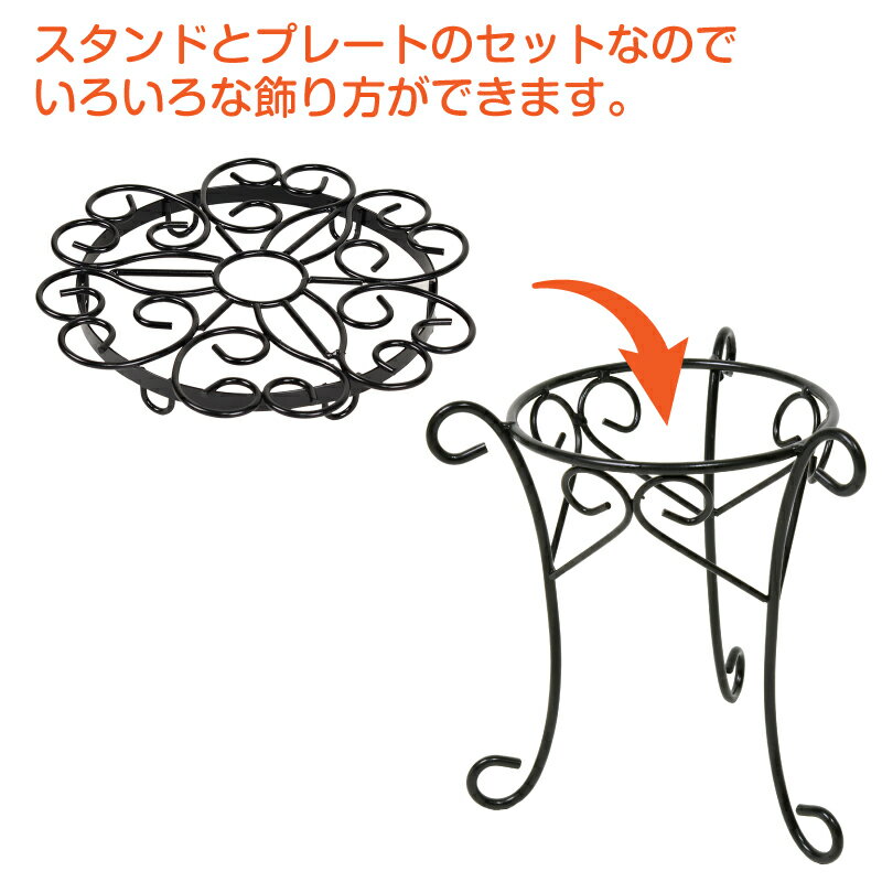 すっきりとしたデザインの アイアン製フラワースタンドと、アラベスク模様のフラワープレートのセットです。