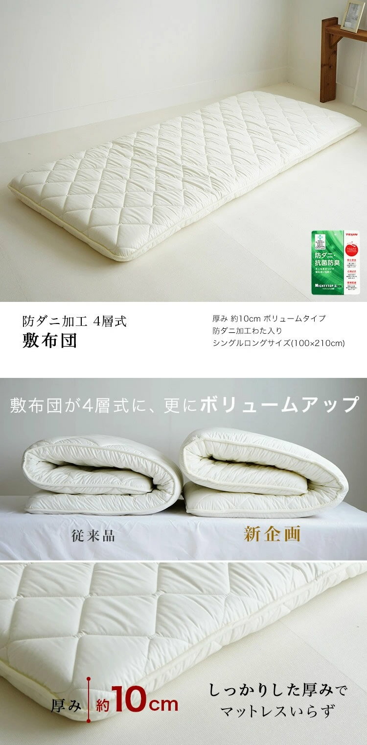 単品購入もできます→ 日本製 防ダニ 4層式敷布団 サイズ:約100×210cm 厚み:約10cm 側生地:ポリエステル100% 中身:巻綿:ポリエステル100%1kg マイティトップ2ECO 中芯:上層 プロファイルウレタン 5cm下層 ポリエステル固綿 2kg 仕様:圧縮加工 ★